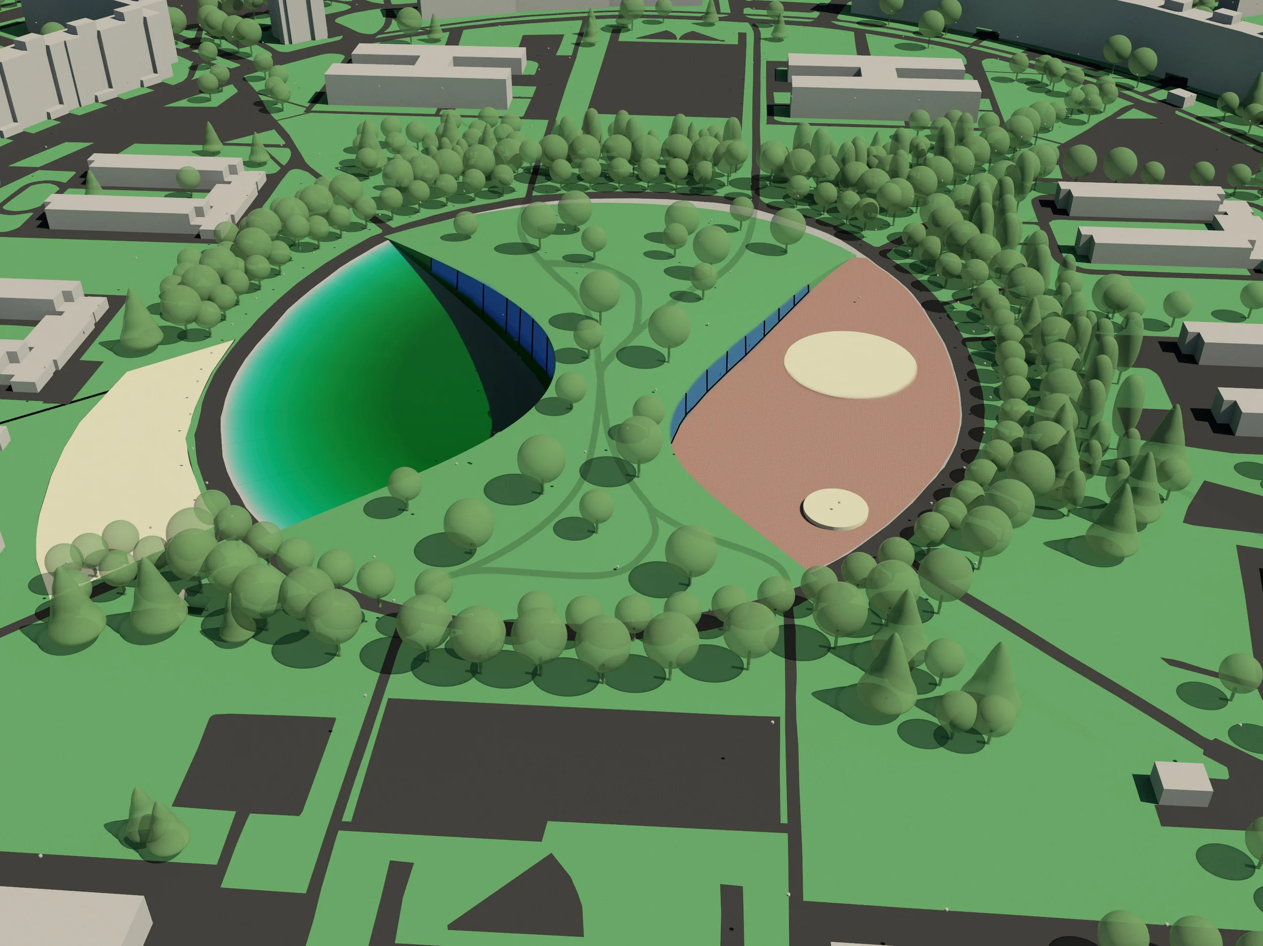 This bridge is a new social focus and a good first step into converting Õismäe to a place of its own and not just the sleeping City it is perceived today. The bridge encompasses a multifunctional public center for a library, dancehall and restaurant all according to the needs of the residents. A part of the blue pond will be kept and visible from the building as well as the outside where a small sandy beach is located. On the other side of the green bridge a new square will take form and create a public place outside the public building.
