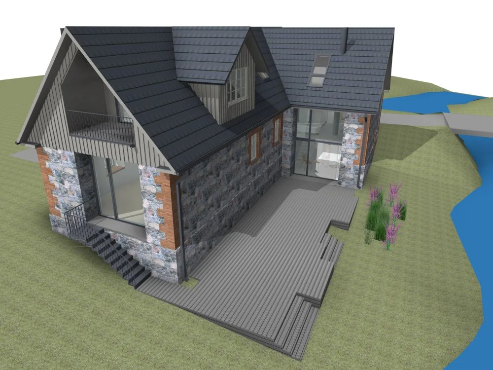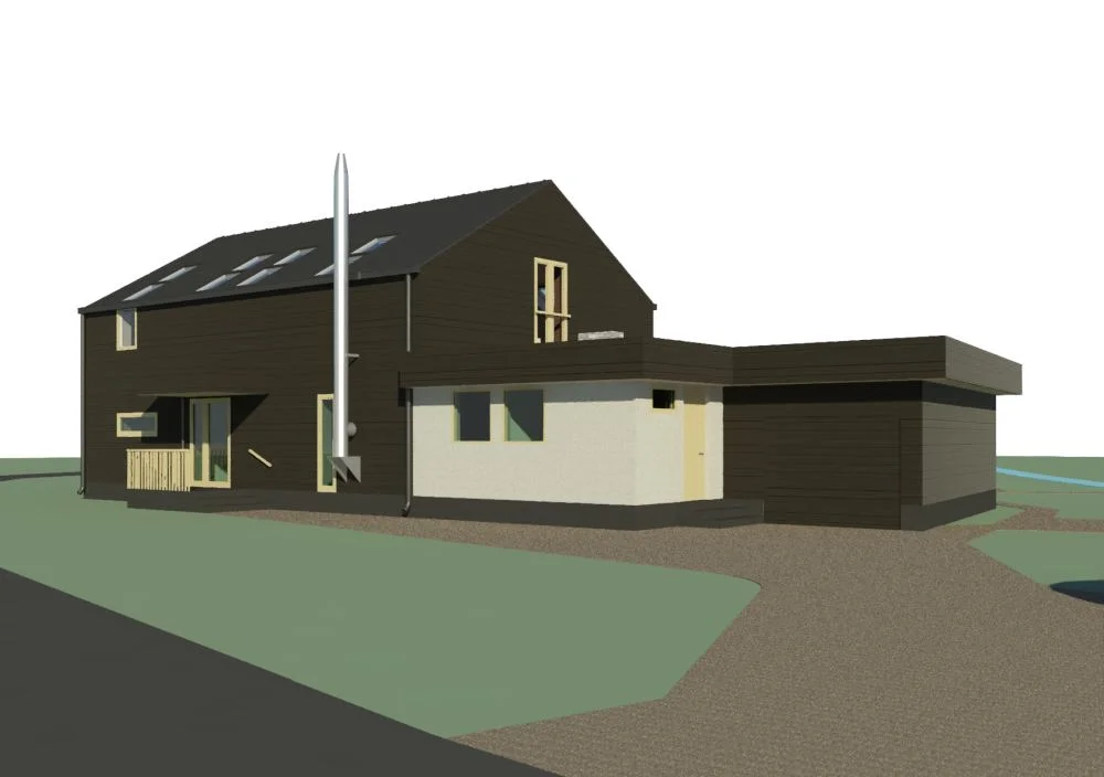 Olemasolevale hoonemahule on kavandatud juurdeehitus 22% hoone maapealsest kubatuurist. Juurdeehitus on planeeritud olemasoleva terrassi vundamendi kontuuris. Ühekorruselise puidust hoonemahu katus on kujundatud katuseterrassina. Välisviimistlus on lai püstine laudis mis värvitakse sama toonis põhimahu välisvoodri katteliistude tooniga.